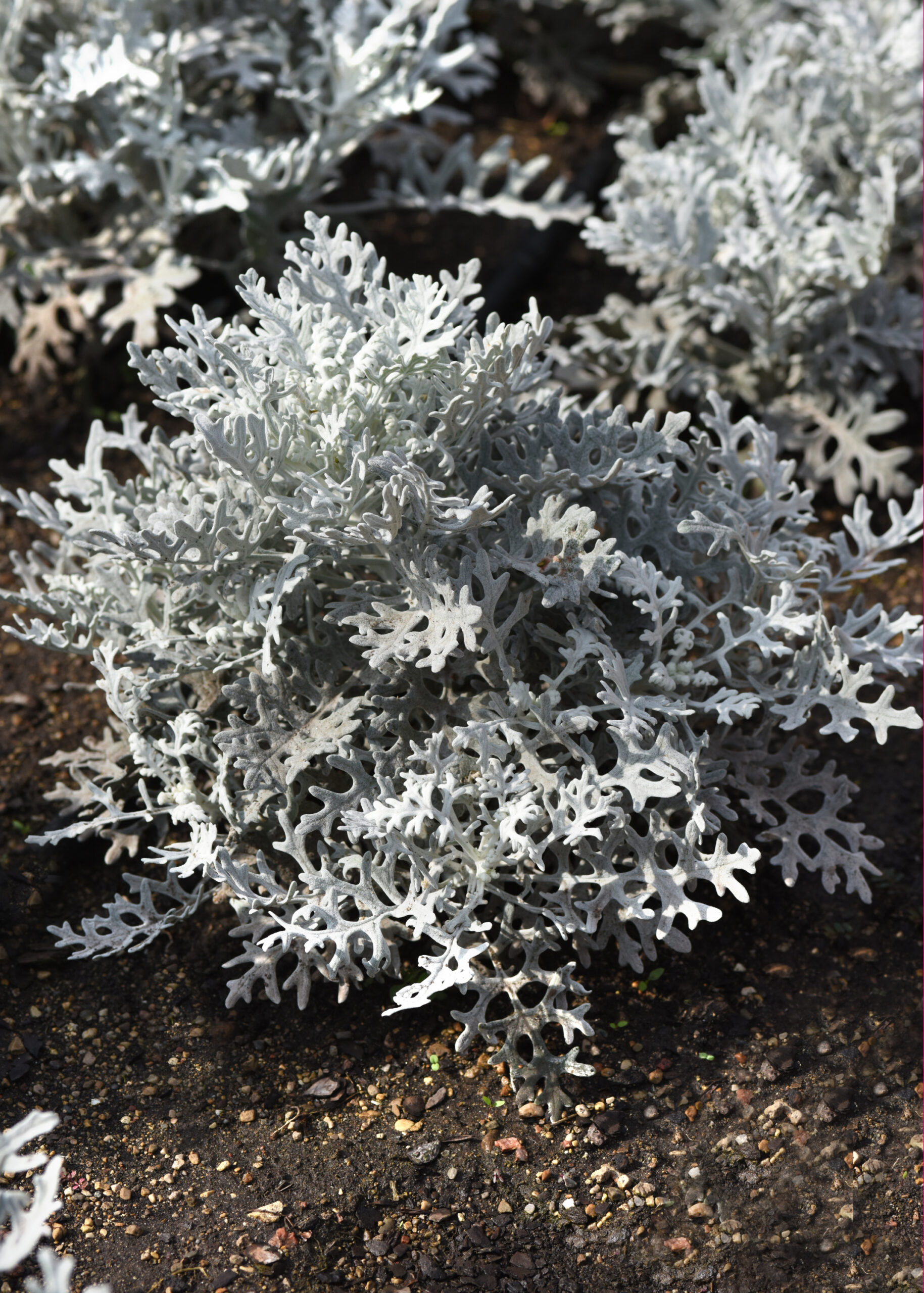 Dusty Miller, Silver Dust 8-10″ tall Plant in sun Sold in a 4 1/2″ pot for $6.50